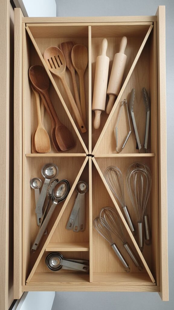 Standard horizontal dividers often fail when it comes to long kitchen tools like rolling pins, ladles, or bread knives. By placing dividers diagonally, you maximize the length of the drawer space, allowing those awkward items to fit comfortably without getting stuck.
