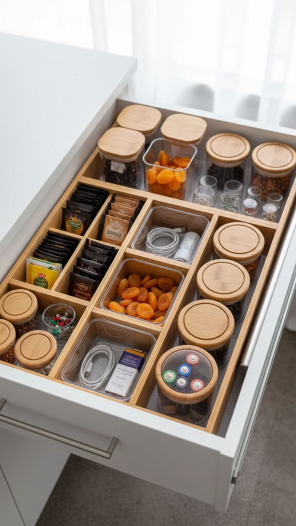Bamboo is a popular choice because it is durable, sustainable, and looks like a built-in custom feature. However, clear acrylic is excellent for junk drawers because it allows you to see small items easily and wipes clean quickly.