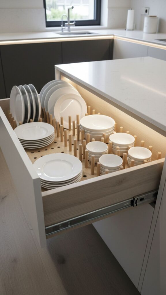 If you have deep drawers, stop straining your back to reach into overhead cabinets for heavy plates. Use a pegboard system in your deep drawers. The adjustable pegs keep stacks of plates and bowls secure so they don’t slide around when you open and close the drawer.