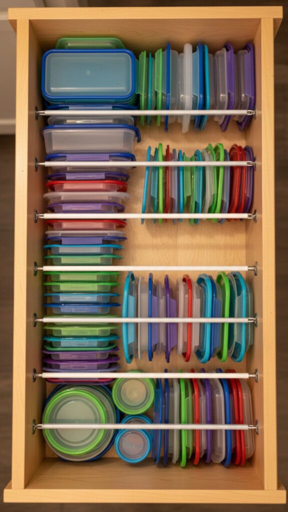 Tupperware lids are the arch-nemesis of an organized kitchen. Use short tension rods inside a drawer to create vertical compartments. This keeps lids standing upright and sorted by size, rather than in a chaotic heap.