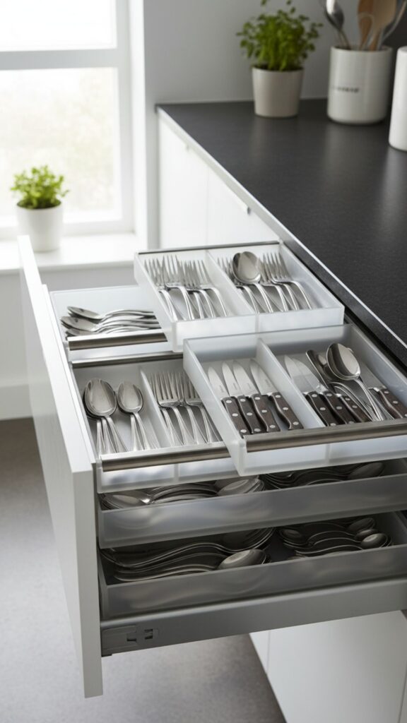 If your silverware drawer is narrow, a standard flat tray might not fit all your pieces. Angled, stacked cutlery trays use vertical height to overlap the handles of spoons, forks, and knives. This clever design cuts the required space in half.