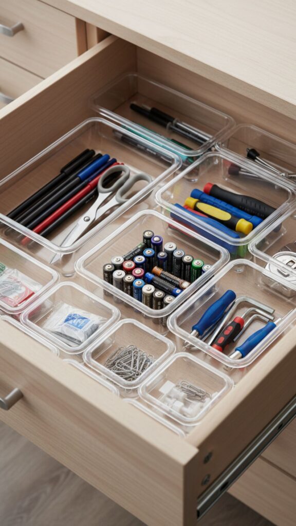 The “junk drawer” is necessary, but it doesn’t have to be a mess. Use a set of clear acrylic bins in various sizes to play “Tetris” with your miscellaneous items. Batteries go in one small bin, rubber bands in another, and pens in a long bin.