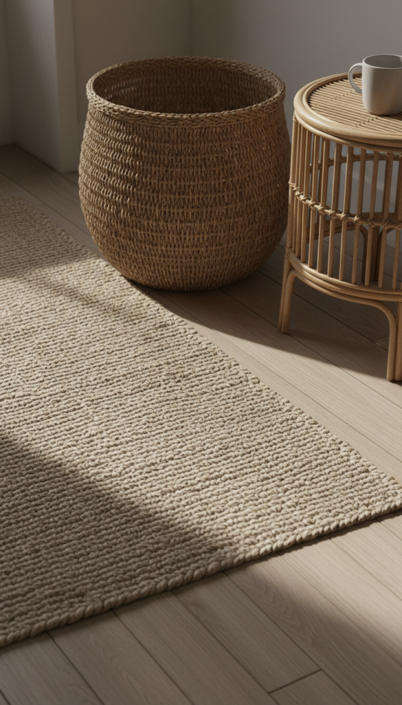 Light wood flooring, such as white oak or maple, is ideal as it mimics the look of driftwood or a boardwalk. If replacing floors isn’t an option, large area rugs made of jute, sisal, or wool in light colors can instantly transform the ground beneath your feet.