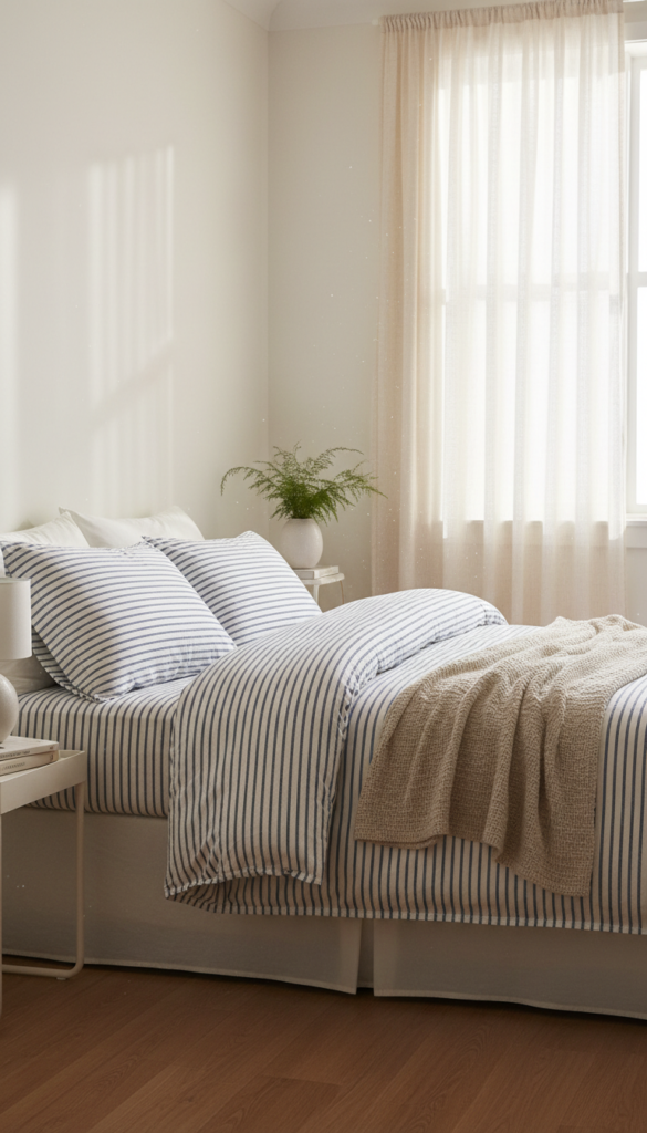 - Bedding: A duvet cover with thin blue ticking stripes.