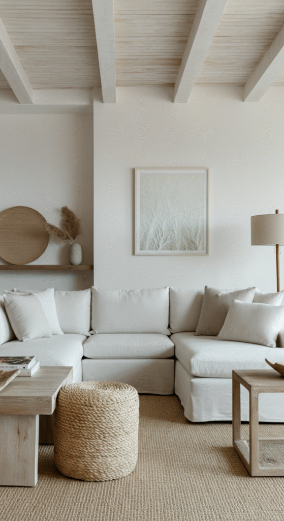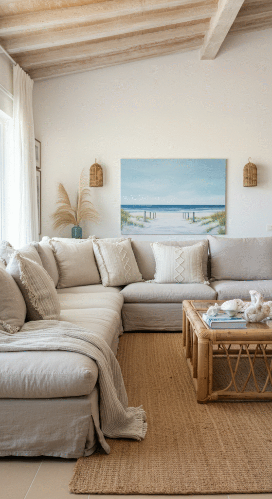 One of the simplest yet most sophisticated coastal looks is the whitewashed style. Whitewashed wood, combined with a soft, neutral-toned U-shape sofa, creates a serene, calming environment. This style is perfect for smaller spaces as it reflects light and makes the room feel larger and more open.