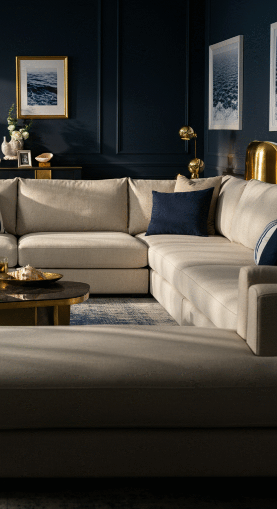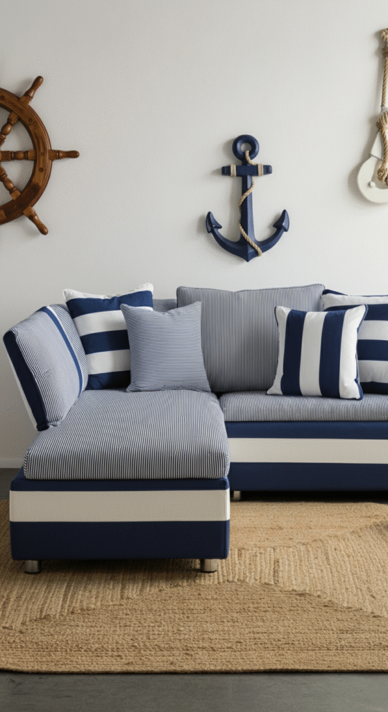 Nautical stripes are an iconic feature of coastal design. To add this to your U-shape sofa, choose a fabric with horizontal stripes in navy, white, or muted pastel tones. These colors evoke images of boats and beach huts, instantly giving your living room a touch of the sea.