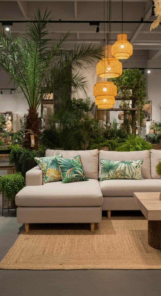 Pair these plants with your U-shape sofa by choosing throw pillows or blankets featuring tropical prints, like palm fronds or abstract botanical patterns.