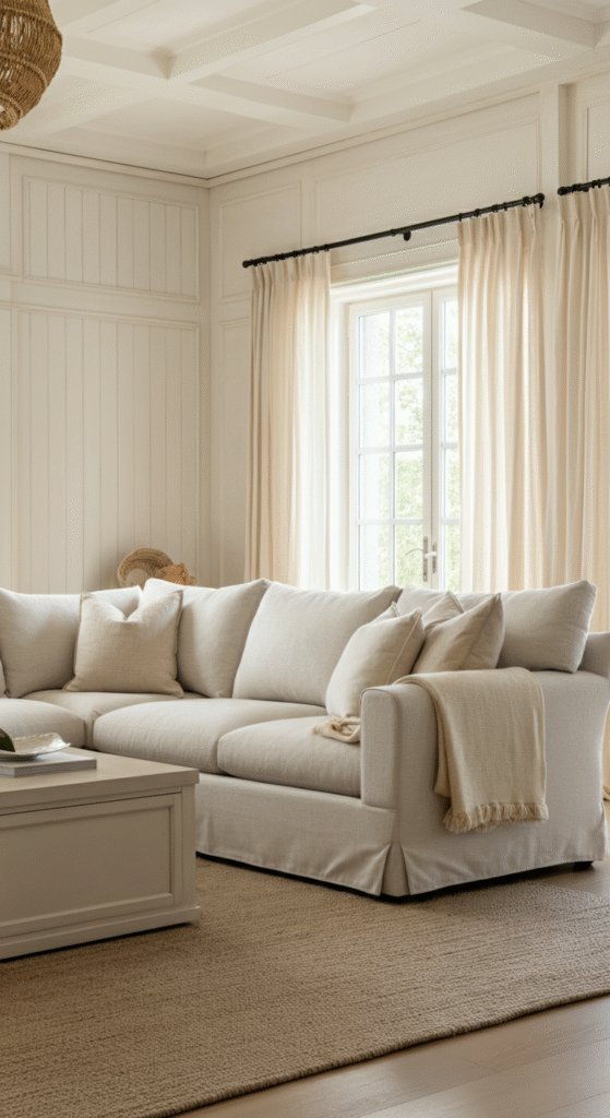 For your U-shape sofa, opt for fabrics like linen or cotton, which are breathable and feel light, perfect for a coastal living room. Additionally, incorporate other natural textures like jute rugs, sisal baskets, and wicker furniture to bring an earthy, organic vibe to the room.