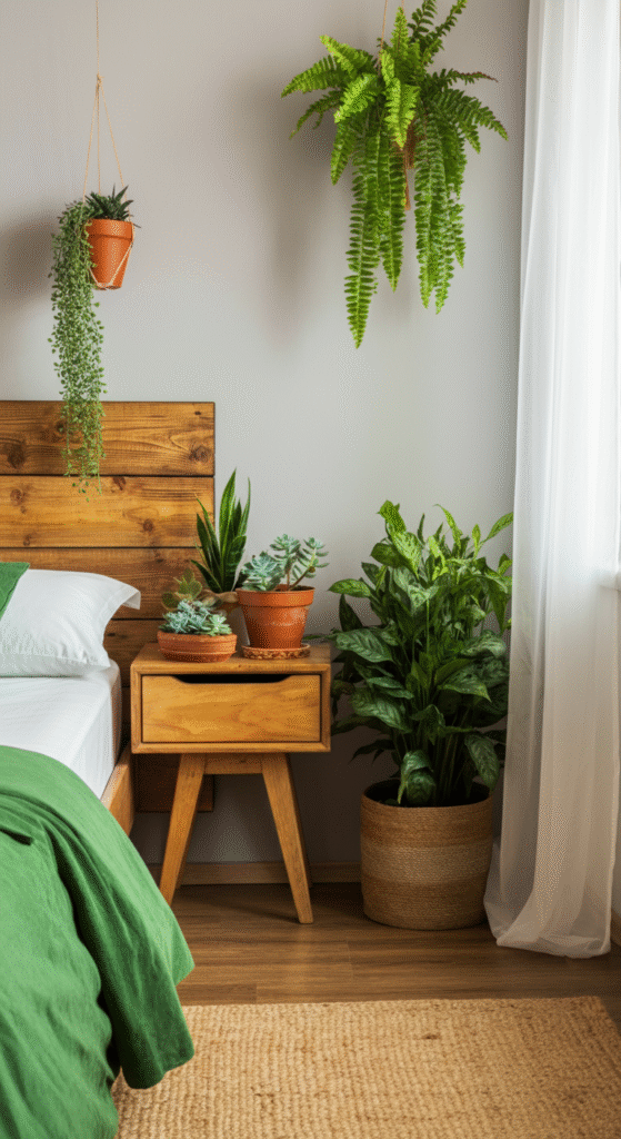 Plants like peace lilies or snake plants are easy to maintain and purify the air, creating a serene atmosphere. A wooden headboard or bedside table can add warmth and a rustic touch to the room.