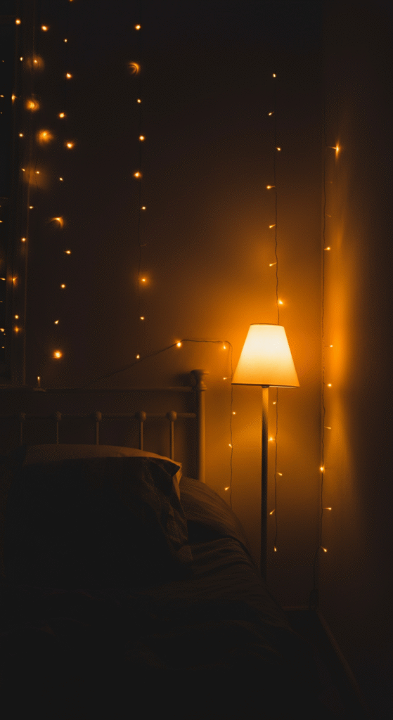 Warm, soft lighting from table lamps, string lights, or sconces creates a relaxing ambiance. Avoid harsh overhead lights.