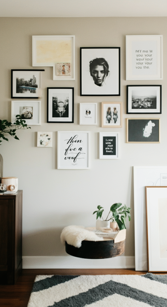 Consider creating a gallery wall that blends different art pieces or use a statement piece that draws attention.