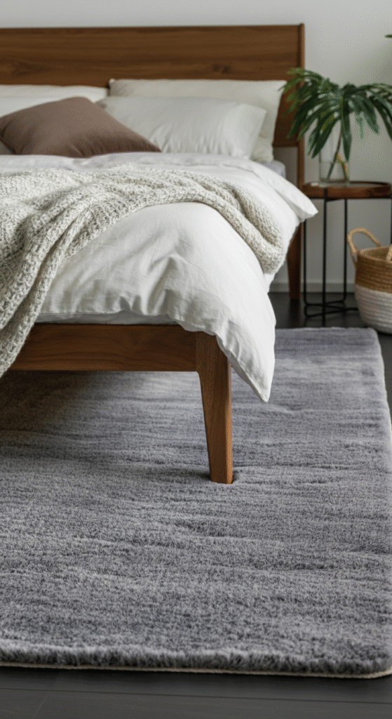 Opt for a rug that complements your bedding or creates a pleasant contrast to break up the neutral tones.