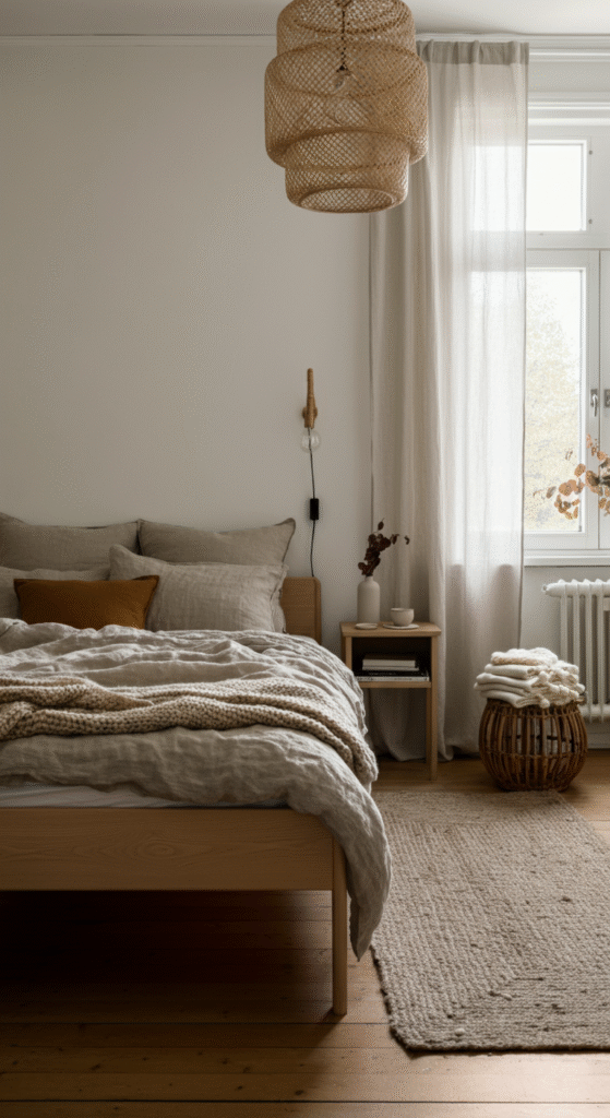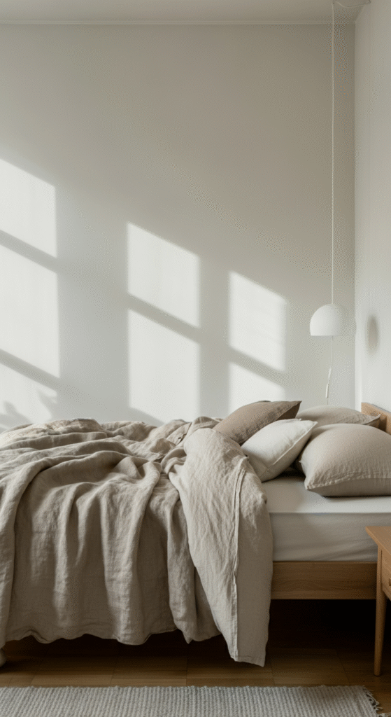A soft neutral Scandinavian bedroom feels like being wrapped in quiet comfort.