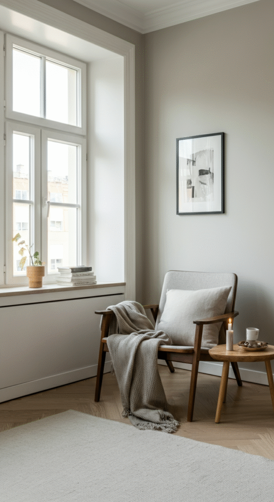 A simple chair, a soft throw, and a small side table create a quiet corner for rest and reflection.