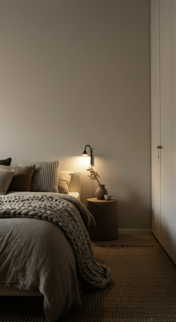 Layered bedding is essential here. Crisp cotton sheets, a textured linen duvet, and a wool throw add visual interest without color overload.