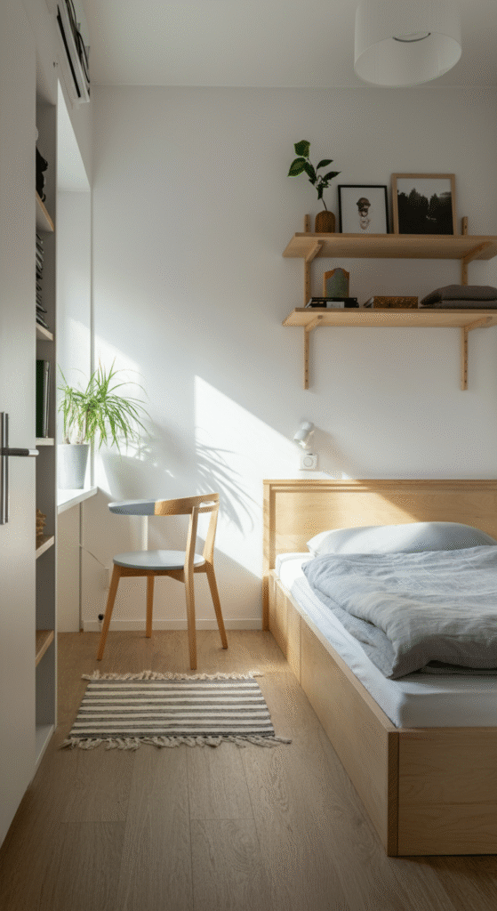 A simple wooden bed frame paired with matching shelves or a desk keeps the space cohesive.