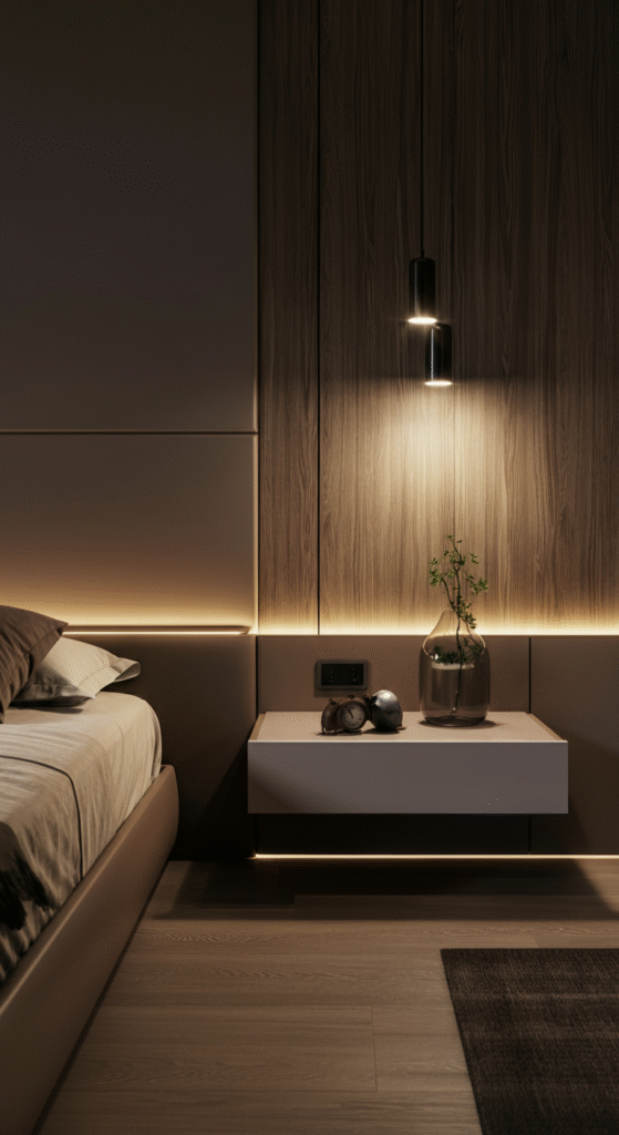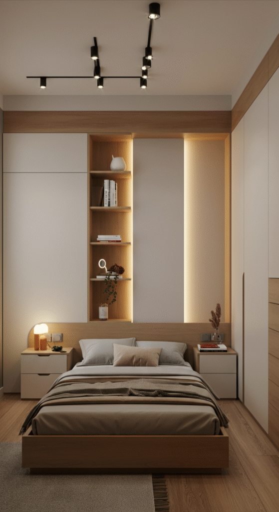 A modern cozy bedroom usually starts with wood. Soft oak, ash brown, or light walnut. A simple wooden platform bed, two slim bedside tables, and a low dresser can completely transform the atmosphere.