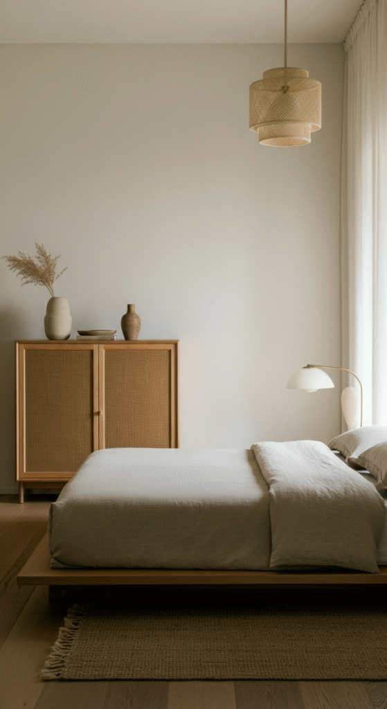 For a Japandi bedroom set, choose a low height wooden bed frame, neutral toned nightstands, and a storage bench or woven cabinet. Everything stays simple but warm.