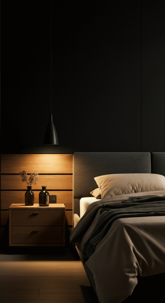 Many people avoid black because they think it will darken the space. Actually, when used with soft lighting and warm bedding, black adds depth and comfort.