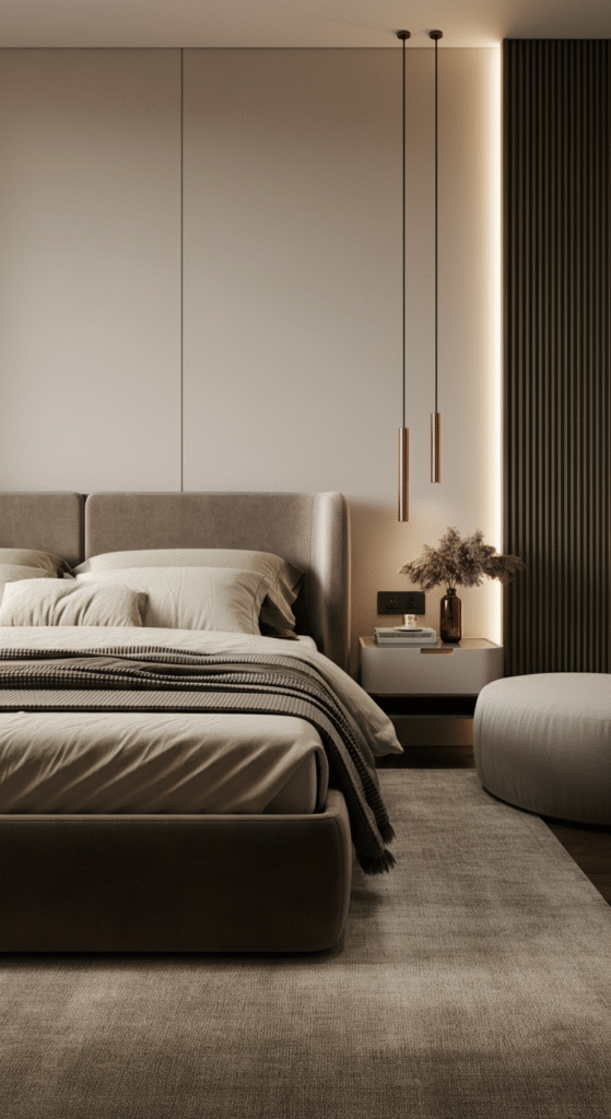 Pair the bed with slim metal bedside tables or floating nightstands. Keep the color palette soft. Beige. Cloud grey. Misty brown. A matching bench at the foot of the bed enhances that hotel comfort vibe.