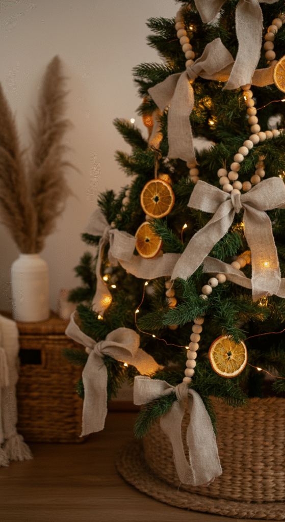 Decorate using natural materials like jute, linen, wooden beads, dried oranges, and pampas grass. Add a hint of metallic accents like muted gold or bronze to keep it festive without overpowering the earthy look.