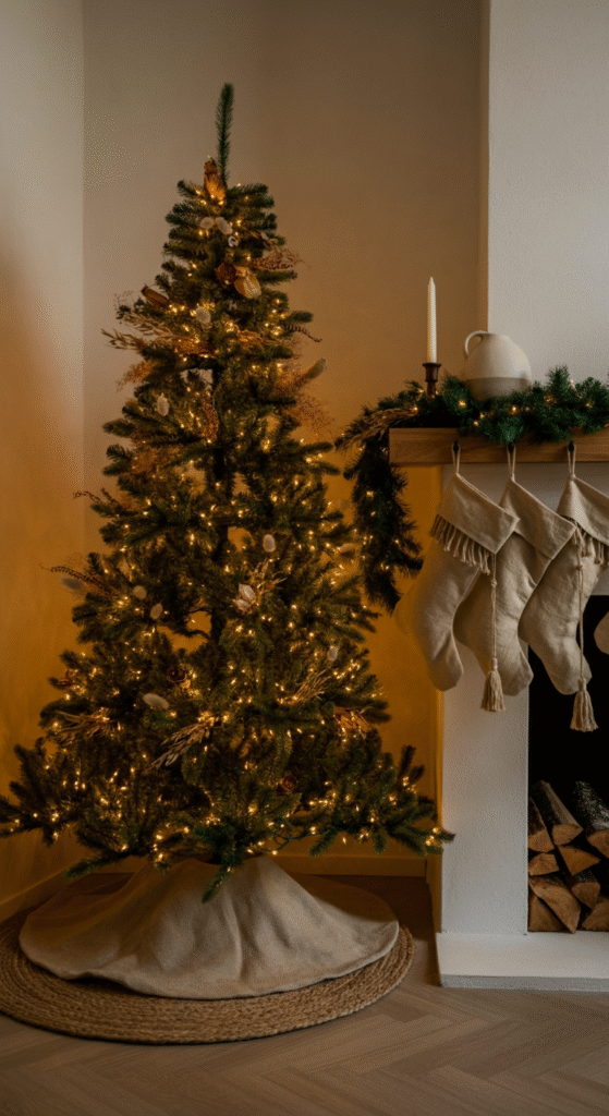 Keep lighting warm — think golden fairy lights, not stark white LEDs. The result is a tree that feels organic, calm, and deeply inviting.