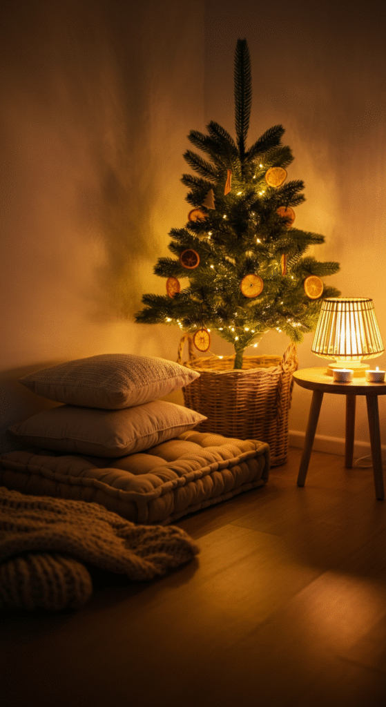 Use lanterns or bamboo floor lamps for soft, diffused lighting. You can even place a small Christmas tree in a basket nearby for that picture-perfect nook.