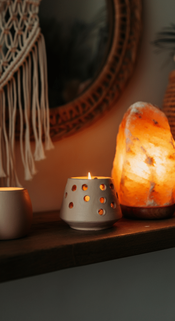 Lighting can make or break the mood of a Boho Christmas setup. Ditch the harsh, bright lights for hand-poured soy candles, clay holders, and Himalayan salt lamps.