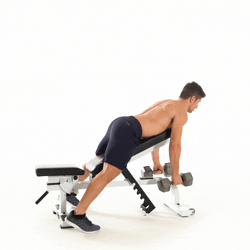 - Place one knee and hand on a flat bench, holding a dumbbell in the opposite hand.