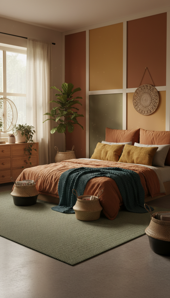 To create an ethereal vibe, you can layer different shades of these earthy tones across your walls, bedding, and rugs. This cohesive yet dynamic color scheme makes the room feel both warm and open, perfect for a restful environment.