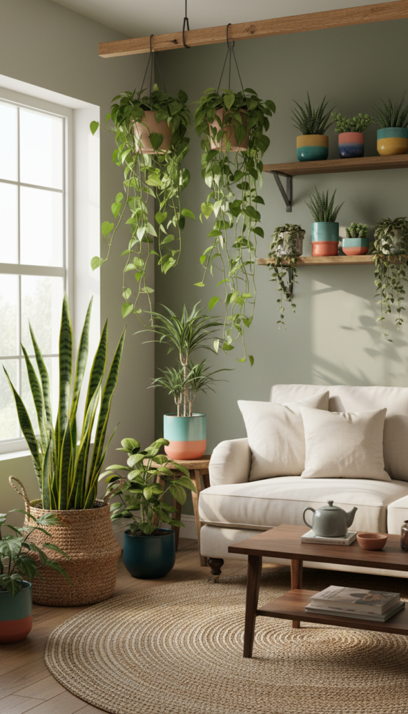 Indoor plants like snake plants, pothos, ferns, and succulents thrive in Boho spaces and add a refreshing touch of greenery.