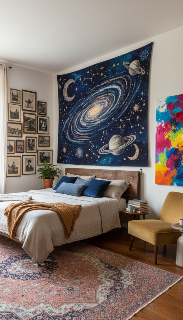 Interesting fact: Tapestries, in particular, are a hallmark of Boho design. They add color and texture to the walls while creating a sense of warmth. A large tapestry featuring a celestial theme, for example, can make your space feel ethereal and dreamy.