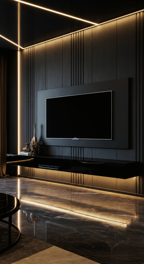 This design deserves a special mention. Integrated LED lighting — whether under the shelf, around the TV panel, or behind the unit — transforms a regular setup into a cinematic focal point.