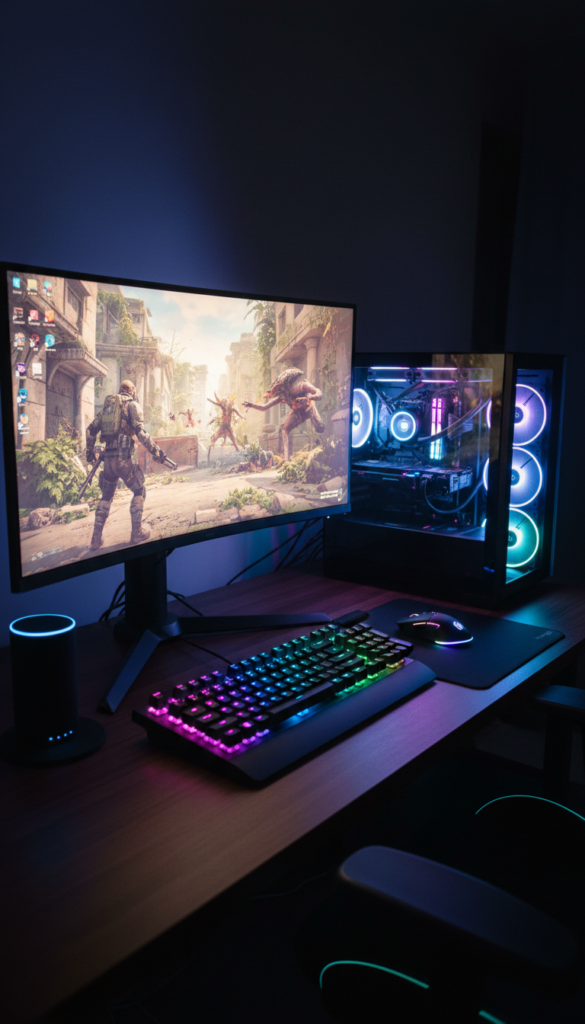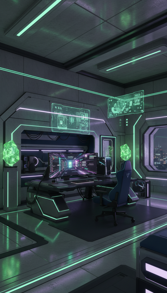 Incorporate high-tech gear like an RGB keyboard, top-tier gaming monitor, and a smart assistant. Enhance the room with neon lighting and floating furniture to add a dynamic atmosphere.
