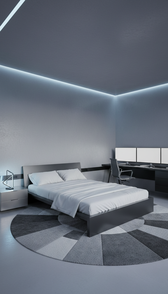 For a futuristic look, go for metallic tones, cool blues, and grays. Add neon or LED lighting to highlight specific areas.