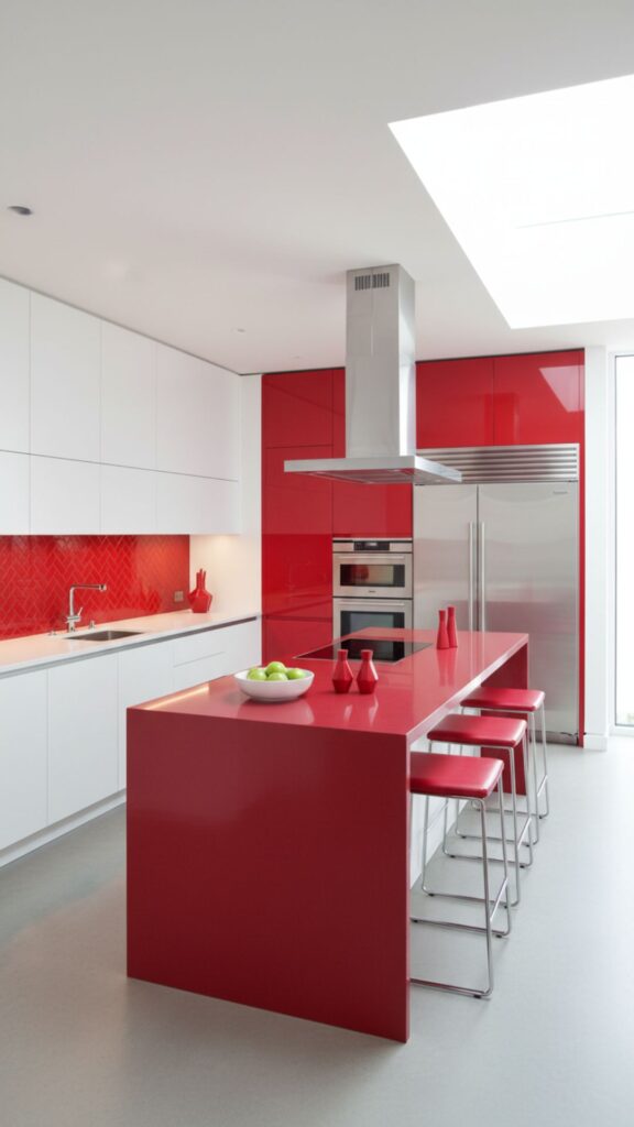 If you want your kitchen to have high energy and personality, vibrant red is the answer. This bold choice stimulates the appetite and creates a lively atmosphere. It’s perfect for those who aren’t afraid to make a statement.