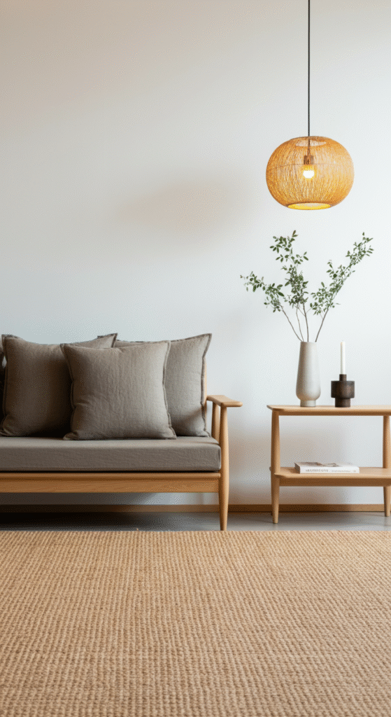 Japandi living rooms love open spaces and visual flow. Try a floating layout — pull your sofa and coffee table a few inches away from walls.