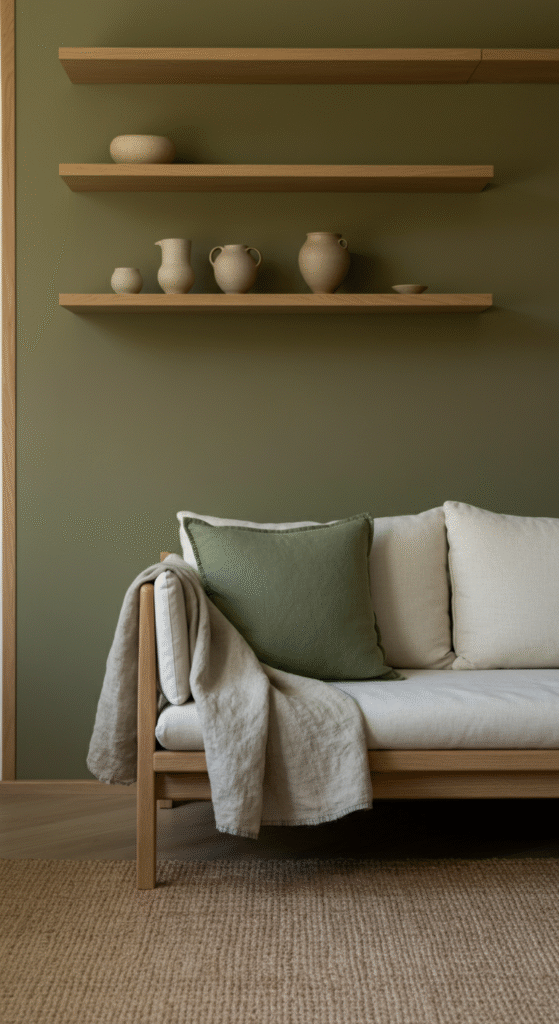 Use off-white walls, oak furniture, and touches of muted sage or charcoal for visual grounding. Keep accessories minimal — perhaps a textured linen throw or handcrafted pottery.
