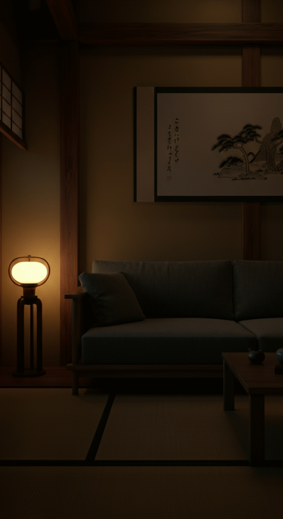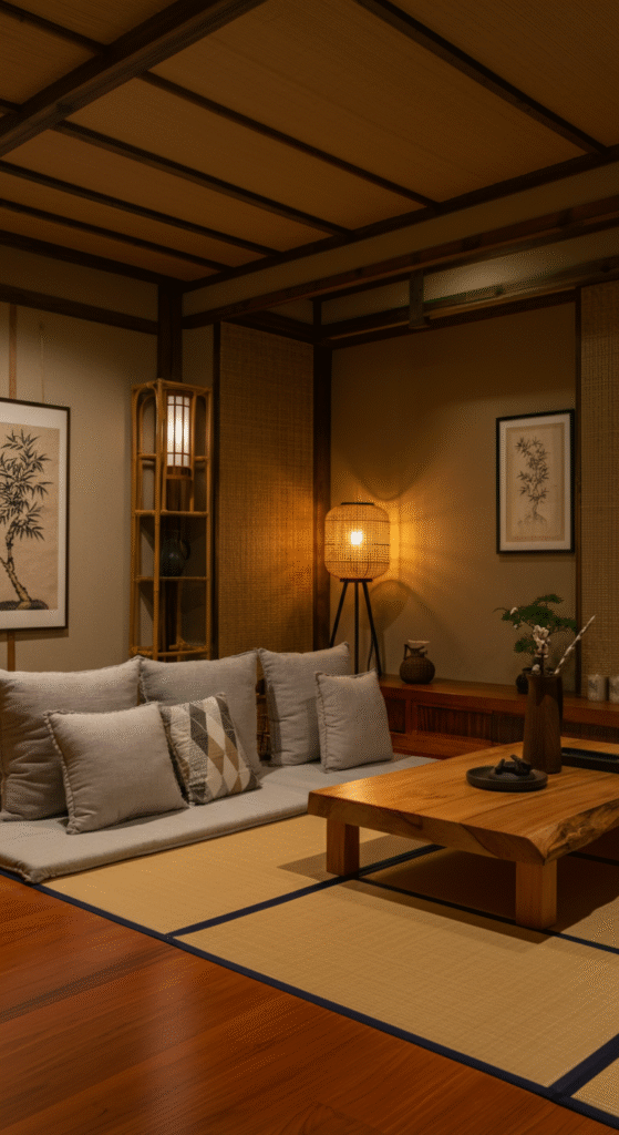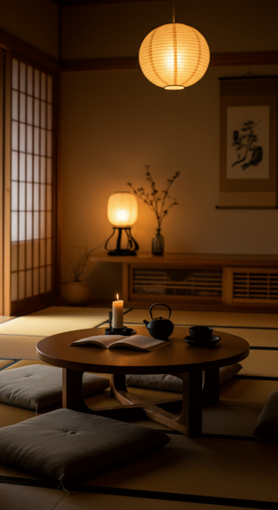 Lighting should be soft and layered — paper lanterns, floor lamps, or candles for a cozy yet uncluttered atmosphere.
