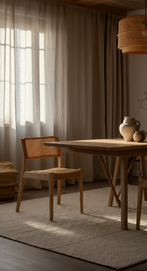 Start with the basics — declutter, simplify, and choose neutral tones. Introduce natural textures like wood, rattan, linen, and ceramics. Swap bright colors for soft earthy hues such as beige, taupe, sand, and sage. Add plants, floor cushions, or low wooden furniture to bring warmth and authenticity.