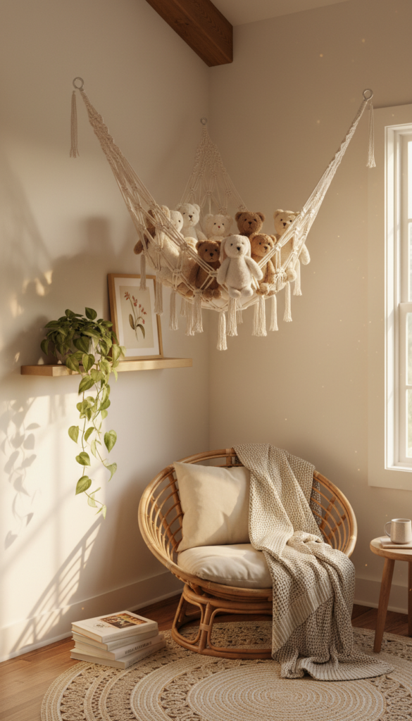 Utilizing vertical space is a game-changer for smaller bedrooms, and a plushie hammock offers a relaxed, bohemian vibe that fits perfectly with the Jellycat aesthetic. Instead of crowding your bed, suspend a macramé or mesh hammock in a corner. This creates a dedicated “cloud” for your fluffier friends, like the Bartholomew Bear or the Fuddlewuddles, allowing them to look down over the room.