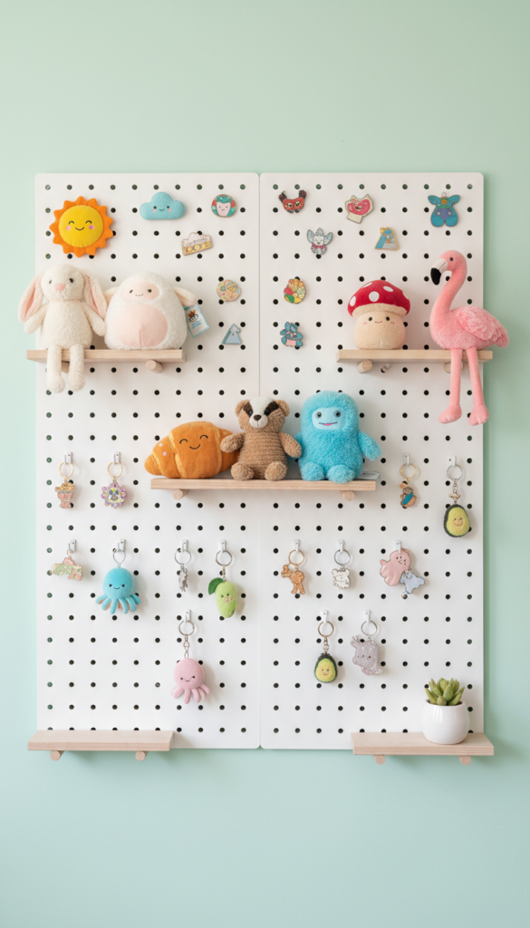 For a modern, highly organized aesthetic, a pegboard wall is a brilliant solution. It allows for complete customization. You can install small shelves for sitting plushies and hooks for hanging ones (like the monkeys or bag charms). This display method turns your wall into a customizable grid of cuteness.