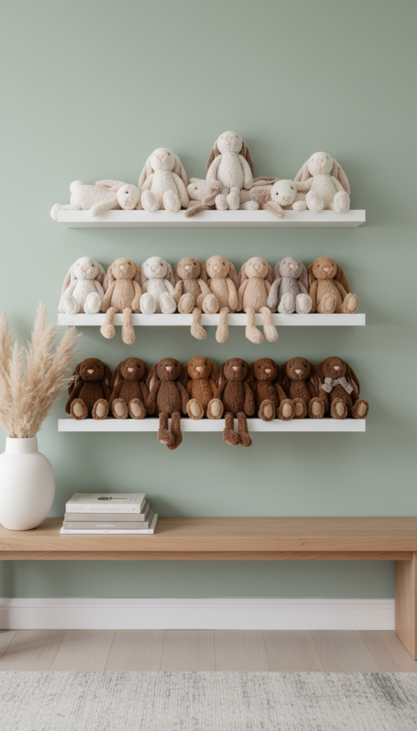 For serious collectors, color coordination is the most aesthetically pleasing way to display a large number of Jellycats. Installing floating shelves painted in white or light wood tones provides a neutral canvas that allows the plushies to pop. Arrange your Bashful Bunnies or other monochromatic collections in a gradient effect—fade from cream to blush pink, then to lavender and blue.