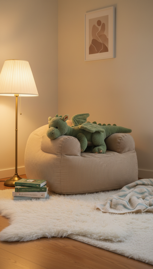 Create a dedicated relaxation zone by pairing a comfortable bean bag chair or a floor cushion with your largest, most huggable Jellycats. This is where the giant-sized plushies shine. A Massive Bartholomew Bear or a Huge Dragon creates an inviting focal point that practically begs you to curl up with a book.