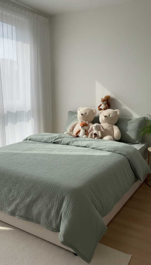 Your bed is the centerpiece of the room, and styling your Jellycats here requires strategy to avoid a messy look. The “pyramid” method works best: place large, sturdy pillows against the headboard, followed by your largest Jellycats, and layer smaller ones in the front. This creates depth and ensures every plushie is visible.