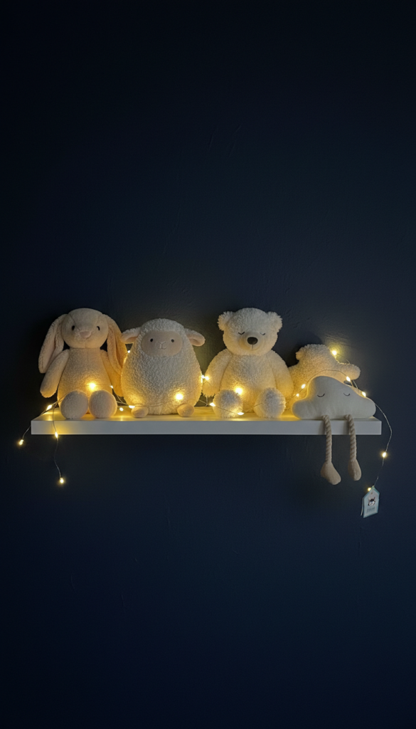 Lighting creates ambiance, and incorporating fairy lights into your Jellycat display adds a magical, dreamy quality to your bedroom. String warm-white LED lights along the edges of your shelves or drape them gently around a plushie hammock. The soft glow highlights the texture of the plushies’ fur, making them look even softer.