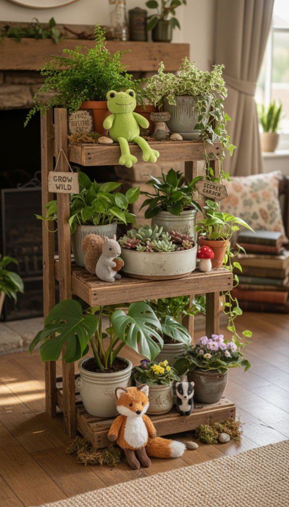 Just be careful when watering your plants! It is best to place the plushies on a separate tier of the plant stand or ensure they are far enough away from the soil to stay clean. This setup creates a miniature forest vibe in your bedroom that feels fresh and alive.