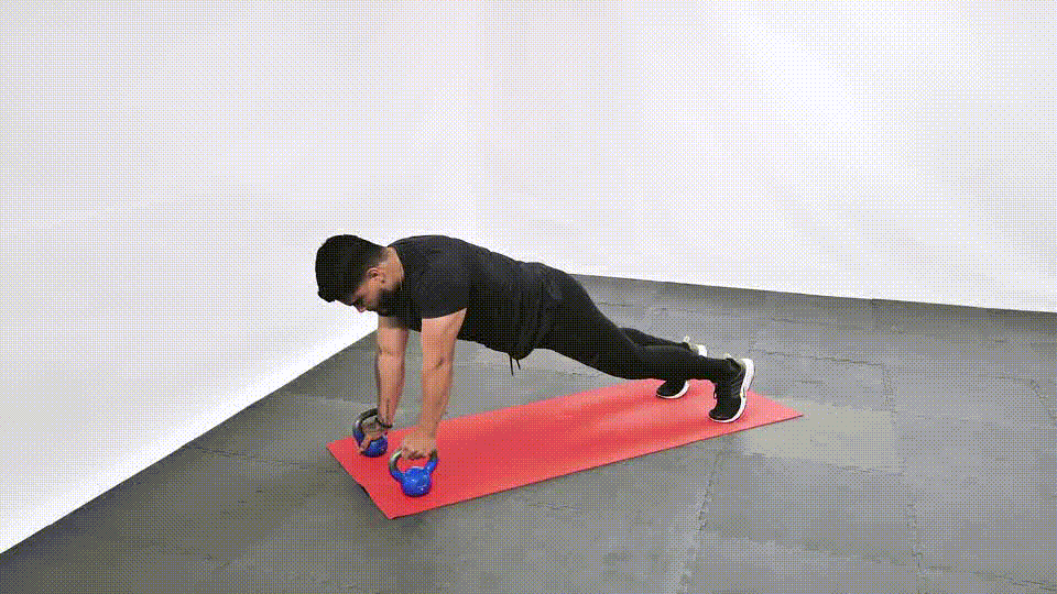 - Get into a plank position with each hand gripping a kettlebell.