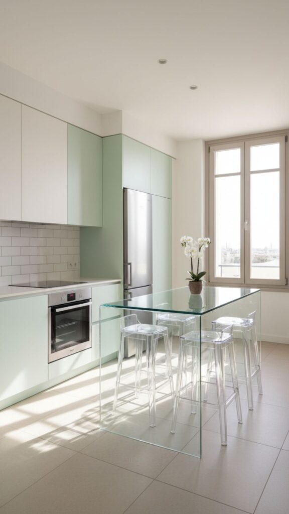 Avoid bulky floor lamps. Use under-cabinet lighting, pendant lights with glass shades, or wall sconces to save space and keep it airy.