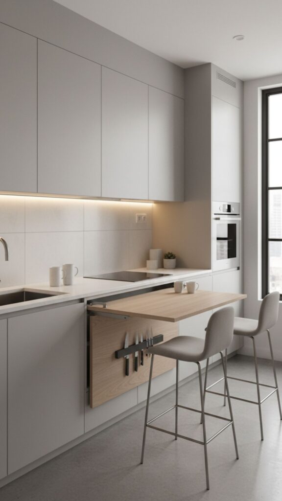 For the ultimate space-saver, look for flexible furniture. A fold-down table provides a sturdy dining surface when you need it and folds flat against the wall when you don’t, instantly opening up the kitchen.